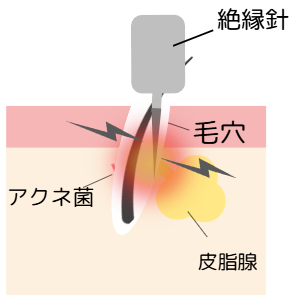 極細の絶縁針をニキビに挿入し、熱エネルギーで皮脂腺を破壊します。